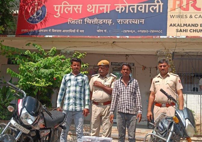 चित्तौड़गढ़, राजस्थान:- कोतवाली चित्तौड़गढ़ थाना पुलिस ने 93 वर्ष के बुजुर्ग के साथ अपहरण कर लुट करने की घटना का खुलासा करते हुए दो आरोपियों को गिरफ्तार किया है। घटना में प्रयुक्त दो मोटर साईकिल जब्त कर लूट की सम्पूर्ण राशि 50 हजार रुपये भी बरामद की गई।